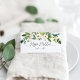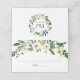 Chic green and white floral place card or table card design features a top border of watercolor greenery and white flowers. Space provided for guest name and table number. Cards reverse to reveal a matching floral frame with your initials and wedding date inside. Designed to match our Alabaster wedding and event collection.