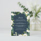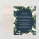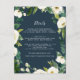 Designed to coordinate with our Alabaster wedding collection, this fresh green botanical and floral guest information card features a border of greenery, foliage and white flowers encircling your key wedding details, like hotel accommodations, welcome reception information, and website, in white lettering on a navy blue background. Add your custom text using the fields provided and use the Customise function to adjust fonts, sizes and spacing.