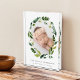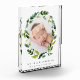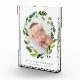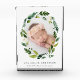 Elegant baby keepsake block features a favourite vertical or portrait orientated photo of your little one, framed with an oval wreath of lush green botanical foliage and white flowers. Personalise with baby's name and birth stats beneath.