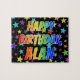This vibrant and fun birthday-themed jigsaw puzzle design features the message "HAPPY BIRTHDAY, ALAN" with the characters having a colorful rainbow spectrum inspired gradient pattern, in addition to a lively stars background pattern. A vibrant puzzle like this might be a fun way to send birthday wishes to somebody named Alan. [~Z0000468]