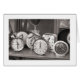 A warm toned black and white photo of a collection of vintage alarm and other clocks on a shelf at a flea market. The photo is framed with a white border.