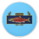 Based on a common military award the Combat Fisherman Badge commemorates surviving combat fishing in Alaska. It features a Sockeye Salmon, in spawning red coloration, on a dark blue background, over a conifer branch wreath. Text reading "ALASKA" is located at the top of the image. Salmon fishing is extremely popular in Alaska, too popular. Thousands of anglers, almost shoulder to shoulder, line both banks of salmon streams, each trying to catch a big fish while trying to keep his line from tangling with those of everyone else. Tempers can flare. This is called combat fishing.