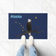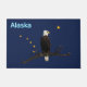 A Bald Eagle scans the sky from his perch on a tree branch; superimposed on a flag of Alaska. Text reading, "Alaska" appears in glowing blue and white.