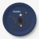A Bald Eagle scans the sky from his perch on a tree branch; superimposed on a flag of Alaska. Text reading "Alaska" also appears in glowing blue and white. Bring these out for your Alaska Day picnic.