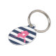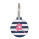 Let your furry friend show some home state pride with this cute Alaska ID tag. Design features a white silhouette map of the state of Alaska in pink with a white heart inside, on a preppy navy blue and white stripe background. Add your pet's name and contact information to the back in white lettering on a pink background.