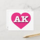 This postcard features a vibrant hot pink heart containing the bold, white, upper case letters AK, the official abbreviation for Alaska, the last frontier. The reverse side of the postcard is blank, awaiting your handwritten sentiments or personalised text.