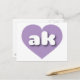 This postcard features a mellow lavender heart containing the bold, white, rounded, lower case letters ak, a playful abbreviation for Alaska, the frontier state. The reverse side of the postcard is blank awaiting your customised text or handwritten sentiments.