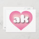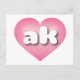 This postcard features a calm, cool, and collected pink heart with a white-washed centre containing the bold, white, rounded, lower case letters ak, a playful abbreviation for the state of Alaska, the last frontier. The reverse side of the card is blank, awaiting your handwritten sentiments or customised text.