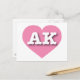 This postcard features a cool pink heart containing the bold white upper case letters AK, the official abbreviation for Alaska, the last frontier. The reverse side of the postcard is blank, awaiting your handwritten sentiments or customised text.