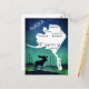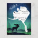 The vast Alaskan Frontier Wilderness outdoor scene with map and wording centred above pine trees with aurora green to blue background by artist Jason Girard. Do you live in Alaska or know someone who has travelled there this postcard is for you.