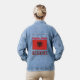 Personalised women's denim jacket features the word ALBANIA showing underneath the Albanian Flag, in the same colours, on a blue denim jacket. Personalise above the flag with a name, in red letters. Great to wear to family reunions, travel groups, and clubs. Wonderful gift for Christmas, birthday, or any occasion.