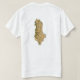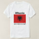 An editable title and slogan accompanies the black double-headed eagle on a red background of the Albanian flag on the front of this t-shirt. The back displays a detailed map of Albania.