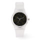 I only have one complaint. I ordered the watch with clear case and strap, and what was sent was white case and strap. I'm going to keep it because 1) it looks very nice in white, and 2) it would take too long to get a replacement made and sent in time for my occasion. Aside from the mix up with the color, the watch does look very good in white. The purple dial is actually sparkly which did not show in the online images. That was a nice surprise. If you like Swatch watches this is very similar to those. It's 33.6mm in diameter, 10.5mm thick, and 40.6mm lug to lug. Stainless steel case back says 3ATM/30m WR, so no swimming or showering or submerging this one. If you like Woodstock, this is a great choice.