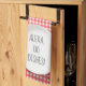 Alexa electronic device command for washing dishes on white dinner plate on red and white gingham pattern.