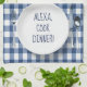 Alexa electronic device command for cooking dinner on a white dinner plate and blue and white gingham pattern.