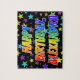 This vibrant and fun birthday-themed jigsaw puzzle design has the message "HAPPY BIRTHDAY, ALEXANDRA" with the characters having a colourful rainbow spectrum inspired gradient pattern, along with an exciting star field background pattern. A vibrant puzzle like this might be a fun way to send a birthday greeting message to somebody named Alexandra. [~Z0000468]
