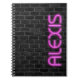 ALEXIS name in glowing pink marquee neon lights on city brick wall.