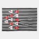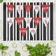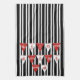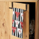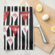 Alice, the Cheshire Cat, Mad Hatter and White Rabbit from the British children's book Alice in Wonderland appear with images of vintage tea pots and a pocket watch on bright red and white bunting pennant flags on a black and white striped background to make this fun and festive literary themed Kitchen tea towel.