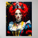 Imagining Alice as the Red Queen fantasy AI generated art in the colours of red,blue,yellow, black and white with ink splatters.