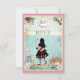 Elegant, whimsical vintage Alice in Wonderland collage rsvp flat cards for weddings, bridal showers, birthday party, sweet 16, baby shower etc. On the front of these cute shabby chic colourful blue and pink invitations a pretty Alice silhouette carrying a cute whimsical pink flamingo , the grinning Cheshire cat, a teapot, glamourous gold pocket watch, jam tart heart, and the white rabbit with his pocket watch. The background is a beautiful colourful blue vintage journal paper with blue roses and white daisies and antique key. There is a pretty pink border with tiny hearts. On the reverse of these lovely, fun invites is the same background with a cute drink me bottle, jam tart heart, teacup and saucer. PLEASE NOTE: All products on Zazzle have flat printed images. All of the text is fully customisable to meet your needs and you can change the font style, colour and size of font if you desire. If you need any assistance customising your product please contact me through my store and I will be happy to help. I have matching products in my store.