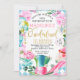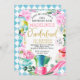 Pink, blue and gold Alice in wonderland themed first birthday invitation for a little girl. The design features a mad hatter hat, cupcake, tea cups and more from the story.