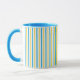 Cute Alice in Wonderland custom mugs for a book themed birthday tea party. Little girl Alice in her blue dress and the Mad Hatter sit on a pretty blue yellow stripes. Customise this whimsical party decor with your own text.