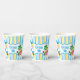 Cute Alice in Wonderland Happy Birthday paper cup for a book themed birthday party. Little girl Alice in her blue dress and the Mad Hatter in a teacup on a pretty blue border on a whimsical baby blue and yellow striped card. Drink Me at a children's tea party or bookworm.