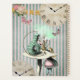 This elegant planner notebook has a fun scene from Alice in Wonderland on both sides. On the front she's having her tea party with the Mad Hatter and the Rabbit and nearby the Card soldiers are standing with a tree of red roses. Above is an antique clock, butterflies, roses and a string of pearls. It's all on a pale green, satin background with a diamond pattern on it. The reverse side is green and white striped with the caterpillar smoking the hookah on the mushroom. Alice is peaking over the edge talking to him. Some clocks, roses, butterflies and a gold banner decorate the rest of the illustration. It's whimsical, it's fun and a bit modern too!