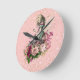Alice in Wonderland on Pink and Gold Glitter Round Clock. Patterns include Alice and flowers.