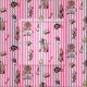 Patterns include Alice, Queen of Hearts, Cards Soldiers, Mad Hatter, White Rabbit, Cheshire Cat, pocket watch, key, crown, potion, tea pot and roses on pink and white striped background.