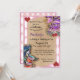 This whimsical invitation features a colourful Alice in Wonderland fairytale tea party theme. An image of the Cheshire Cat is pictured in the top right. The Mad Hatter's hat and a stack of teacups are placed in the bottom left. The background features a baby pink harlequin pattern with a pink frame. Two red hearts are placed in opposite corners to resemble a playing card.