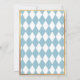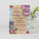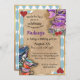This whimsical invitation features a colourful Alice in Wonderland fairytale tea party theme. An image of the Cheshire Cat is pictured in the top right. The Mad Hatter's hat and a stack of teacups are placed in the bottom left. The background features a pale blue harlequin pattern with a gold frame. Two red hearts are placed in opposite corners to resemble a playing card.