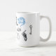 So many fun and whimsical vintage images from the book Alice in Wonderland: the girl Alice, White Rabbit, Cheshire Cat,, the text Drink Me, vintage teapot, cup, pocket watch and keys, and the quotation, Curiouser and curiouser cried Alice, along with butterflies, make this great literary themed blue and black on white ceramic mug.