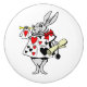 Alice in Wonderland character, the white rabbit with his trumpet, scroll, and wearing his robe with red and black hearts. Fun fairy tale theme.