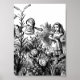 Talking flowers stop Alice to talk as she walks down a garden path in Wonderland. Vintage illustration in public domain.