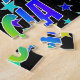 This lively and exciting birthday-themed jigsaw puzzle design has the message "HAPPY BIRTHDAY, ALICIA" with the characters having a colourful rainbow spectrum inspired gradient pattern, in addition to a vibrant star shapes background pattern. An exciting puzzle like this might be a fun way to send birthday greetings to somebody named Alicia. [~Z0000468]