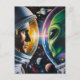 Alien and astronaut in space doing a stare down. Background of stars and planets.