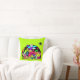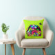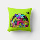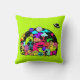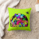 A pillow with a fun doodle using a cosmic theme. A gathering of alien space creatures. Set on an outer space design. You can see a moon, planets, zooming spaceships, stars and an alien ship coming in for landing. Colours include both neon bright and subtle retro pastels. Set on an exciting lime green background.