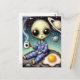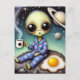 A funny Alien dressed in PJs with a coffee and egg sitting on a rock for breakfast in space adorable AI generated art