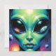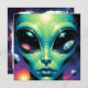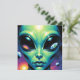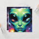 Blank notecard. A captivating otherworldly design with an extraterrestrial alien being with big bulging eyes holding the reflections of other planets, including earth in them.