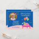 Cute and colourful invitation ideal for a party with a space or alien theme. Features a happy Alien peaking out of a space ship window, holding party balloons and a peace white flag. Great invitation for a girl that enjoys space ships, aliens and stars. Add your child’s photo for a personal touch.