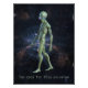Fun space themed poster, with graphic artwork of a green alien wearing colourful galaxy sunglasses, against an abstract solor system looking background. Custom text reads Too cool for this universe, and can be personalised to read what you want.