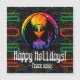 Custom alien tie dye space Christmas magnets! You can "personalise" the greeting, or keep it as is. Features alien with peace sign, tie dye round frame, year on the sides, patterned background, and cool alien typography.