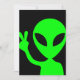 Green and black alien image. The alien is flashing a peace sign.