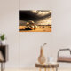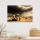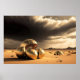 A mysterious sci-fi desert scene featuring monumental golden alien relics half-buried in endless sand dunes. Under a dramatic stormy sky, smooth metallic forms with intricate details suggest remnants of a forgotten civilization. A cinematic surreal artwork that blends science fiction, symbolism, and futuristic atmosphere—perfect for modern interiors and bold statement wall art.