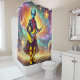This fantasy shower curtain has an alien rockstar pictured on it.