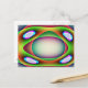 This postcard features a multicoloured pattern of bright psychedelic colours surrounding a central egg shaped structure. It resembles a fantasy of an alien spaceship ready to abduct an earthling.