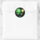 A fun sticker for a science fiction birthday party or just for a fun time. It features a black background with a green alien on it. There is a space on the bottom for a name or message.
