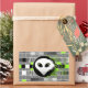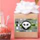ATTENTION EARTHLINGS! Cool retro TV testcard inspired design featuring a stylised alien face and extra-terrestrial interference in shades of black, white, grey and green. A customisable design for you to personalise with your own text, images and ideas. An original digital art image created by Jess Perry.