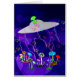 Green alien head pokes out of spaceship and a field of power surged mushrooms in many colours with glowing hearts grows beneath it.